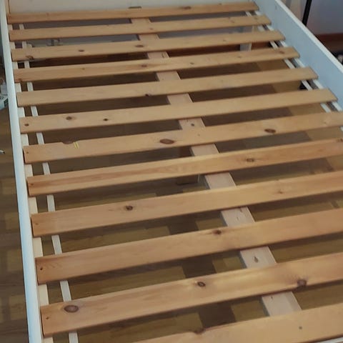 Sängynrunko ja halutessaan joustinpatjat x2 sekä sijauspatjat x2. Runko vaatii pienen fiksauksen keskikannattimen kohdilta. Sänky nyt osissa.
