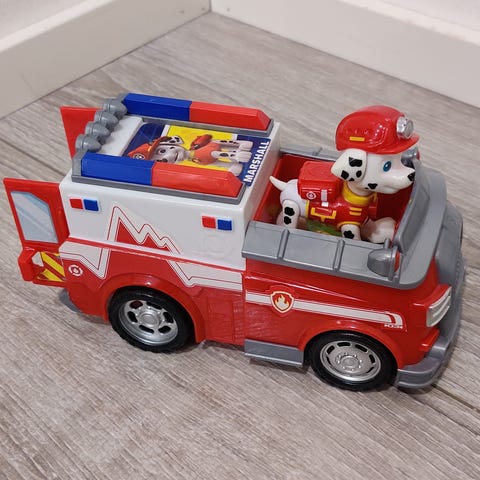 Samppa- figuurissa hieman kulumaa, lähinnä korvissa ja nenässä. Ajoneuvon kunto moitteeton, ääni- ja valotoiminnot toimivat.