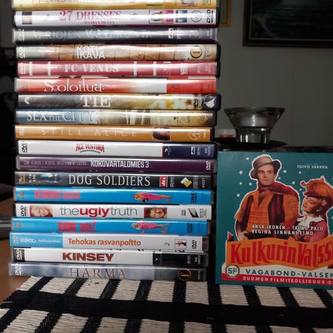 11 kpl kotimaisia elokuvia ja 2 kpl lasten dvd:tä.
