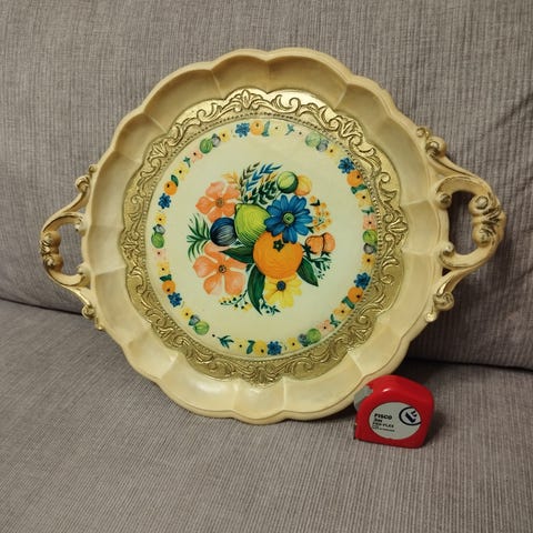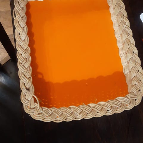 Rottinkinen tarjotin kahvalla, kuviolasi. Mitat 28x23 cm. Korkeus 19 cm.
