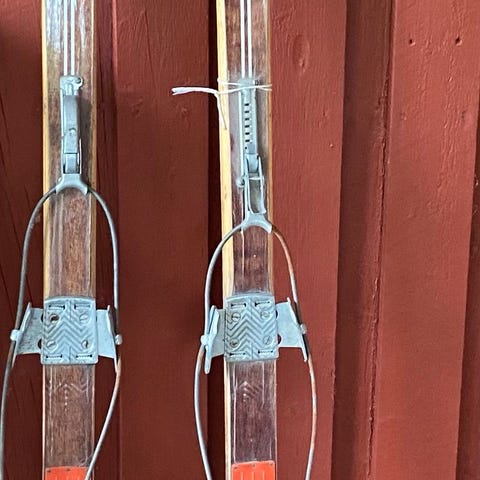 Tässä esim. ulkoseinää koristamaan palanen mennyttä maailmaa. Näillä tuskin enää osallistumaan firman hiihtokisoihin vaan herättävät ennemmin mukavia muistoja vuosikymmenien takaa. Noutamalla/käteiskauppa