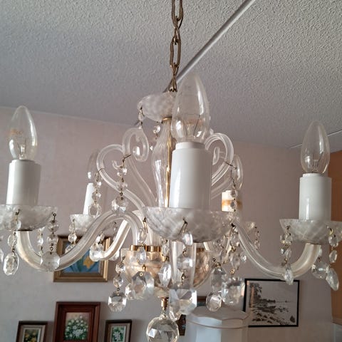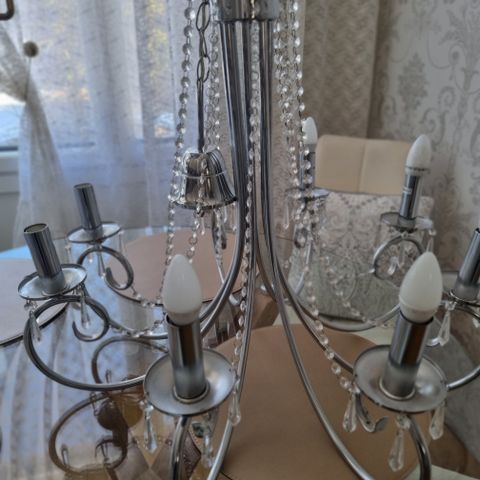 Metallinen kattokruunu, jossa useita käsivarsia ja kynttilälamppuja muistuttavat lampunkannat. Valaisimessa on kirkkaista ja tummista lasikristalleista koostuvia riipuksia ja ketjuja, jotka roikkuvat käsivarsista ja rungosta. Sopii sisäkäyttöön esimerkiksi olohuoneen tai ruokailutilan yleisvalaisimeksi. Lamppukantoihin sopivat kynttilätyyppiset polttimot (kuvissa LED-polttimot). Väri on tumman metallinen, kristallit kirkkaat ja tummat.