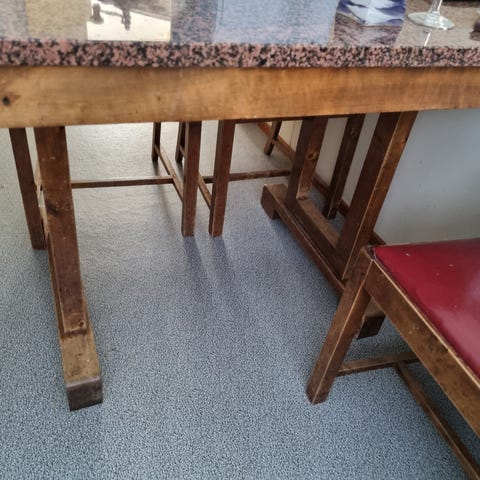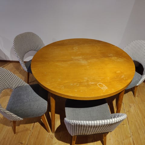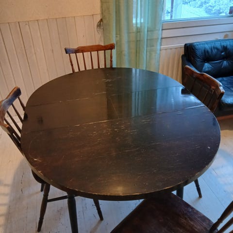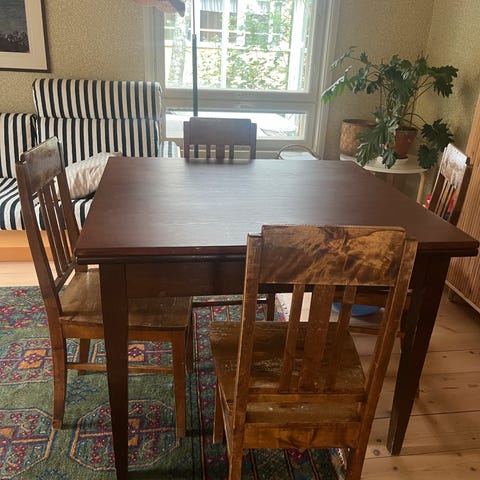 50-luvun puinen ruokapöytä ja 4 tuolia, pinnat kaipaavat entisöintiä. Pöydässä vetolaatikko. Retrohenkiseen kotiin pieneen tilaan sopiva ruokaryhmä.
