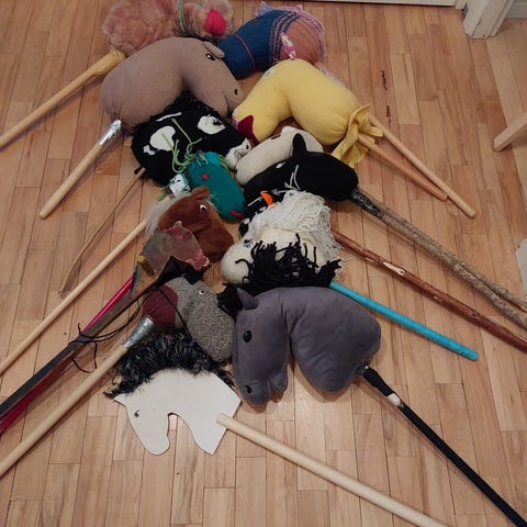 Lasten keppihevossarja sisältää kaksi keppihevosta, harjan, suitset, ohjat, suojat ja muita varusteita. Valkoinen ja ruskea hevonen. Soveltuu lasten leikkeihin ja harrastuksiin.
