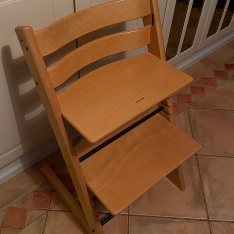 Myydään Stokke Tripp Trapp syöttötuoli, vanhempaa mallia. Ollut puunvärinen, maalattu mustaksi, ajan saatossa saanut osumaan maalipintaan ja ajan puutteen vuoksi jäänyt uudelleen maalaamatta, vaatii hionnan ja uudelleen maalauksen. Mukaan saa halutessaan vanhan mallisen puukaaren (joka vaatii myös hionnan ja maaluksen) ja siihen sopivan nahkaremmin (sekä hyvin pesuissa värinsä menettäneen, mutta ehjän istuinpehmusteen) Nouto Turun keskustasta.