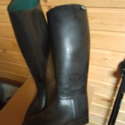Kestävät, kumiset Aiglen ratsastussaappaat ekstraleveällä XXLS-varrella koossa 36. Ehjät ja siistit. Raippa kaupan päälle.