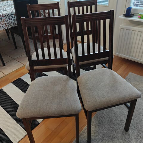 Hyväkuntoiset sekä vähällä käytöllä olleet ruokapöydän tuolit. Yhdessä tuolissa painauma, muuten siistit. Ostettu Vekestä pari vuotta sitten.