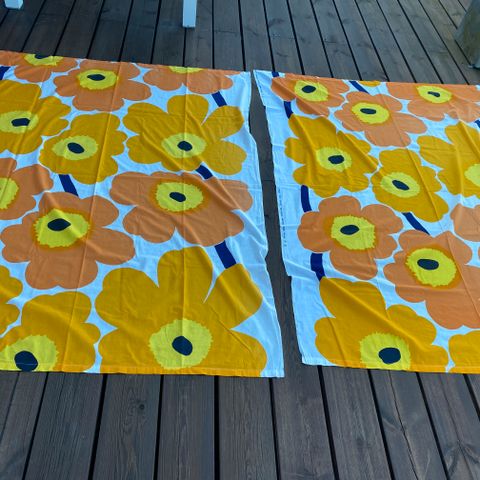Keltaista kevääseen! Marimekko Maija Isolan Unikko joka tuli tuotantoon tässä värissä 90-luvun alussa. Ollut lähinnä varastossa. Teetetty ompilijalla 2 kpl 100 x 170 cm verhoa.