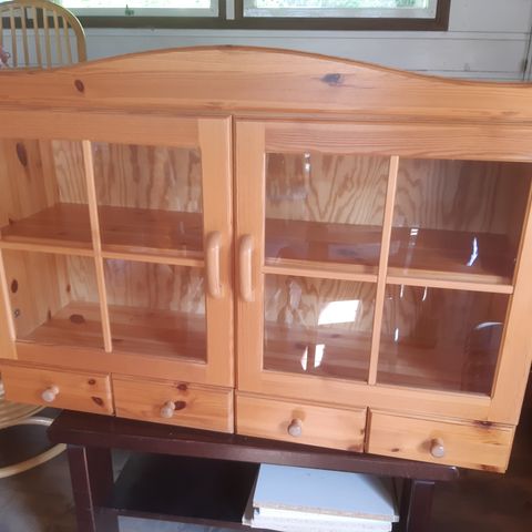 Valkoiseksi maalattu vanha lasivitriinikaappi