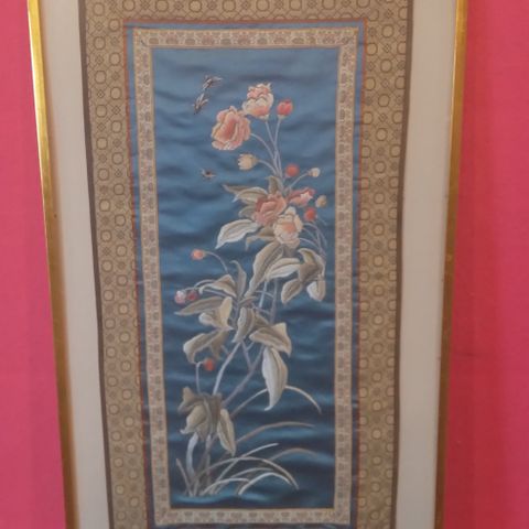 Myös kultalangalla kuvioitu lintu-taulu myynnissä.