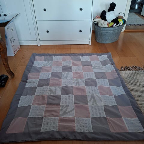 Myydään vauvan tilkkutäkkipeitto / -makuualusta. Peiton sisällä ohkanen vanuvuori. Mitat 98×69 cm. Siisti ja ehjä.