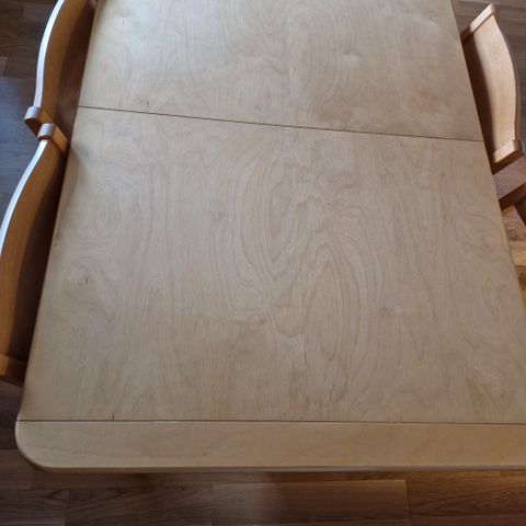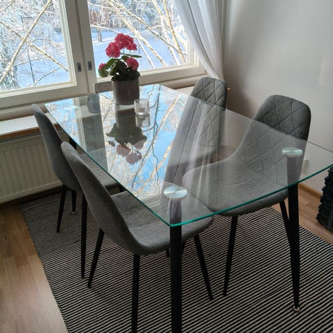 Tumma puinen ruokaryhmä. Parissa tuolissa vähän löysänä jalka mutta saa helposti korjattua esim. liimalla. Pöydässä pieni pala lähtenyt, näkyy toisessa kuvassa