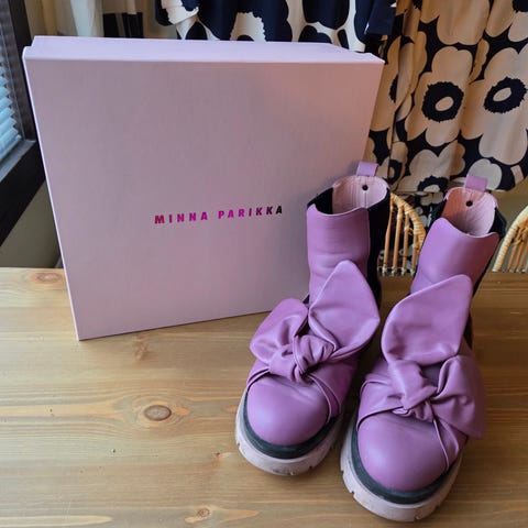 Minna Parikka saappaat koossa 36, väriltään punaiset. Saappaat on valmistettu nahkamateriaalista ja niissä on mustat joustavat sivuosat. Pohja on paksu ja kuvioitu, mikä tarjoaa hyvän pidon. Saappaat ovat nilkkamalliset ja niissä on koristeellinen solmu edessä. Kengillä on koekävelty sisätiloissa ja todettu liian pieneksi omaan pieneen 37 paksulla sukalla. Ovat kuitenkin aika väljää mitoitusta joten 36 ja 36,5 koolle täydelliset riippuen sukasta.