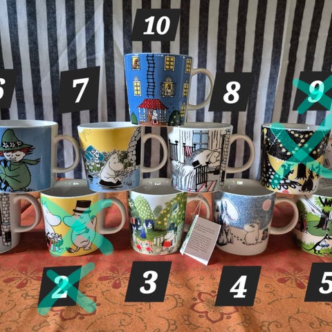 Muumimukeja, kuvista poiketen jäljellä 2 kpl, tarrattomia.