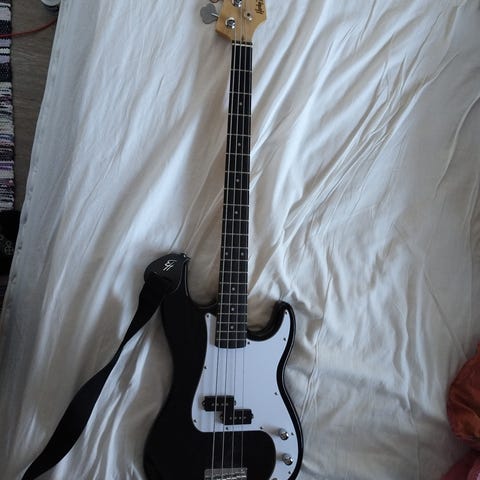 Harley Benton JB-75 sähköbasso luonnonvärisellä viimeistelyllä. Basso on nelikielinen ja siinä on musta pleksi. Mukana kantopussi ja hartke hd25 vahvistin.