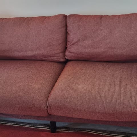 Kissatalous, minkä takia sohvan alaosassa kangas hieman irti ja pinta epätasainen. Näkyy kolmannessa kuvassa. Kaikissa tyynyissä irrotettavat ja konepesun kestävät päälliset. Sohva on mukava istua, mutta jouset ovat iän vuoksi melko löysät.