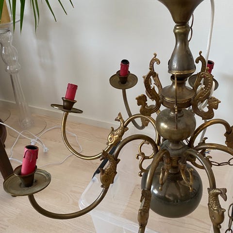Kattokruunuvalaisin viidellä lampulla. Lampun halkaisija n. 50cm ja korkeus 36cm.