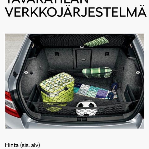 Skoda Suojaverkko malli 3V0 857 221. Musta metalliverkko, joka on suunniteltu käytettäväksi auton tavaratilan ja matkustamon välissä. Sopii erityisesti tavaroiden turvalliseen kuljettamiseen ajon aikana. 4 kiinnikettä tulee mukana, joiden kiinnitys ollut sisäkatossa kiinnityspisteissä. Tämä verkko ollut skoda suberb:ssä. 123x25 (plus kiinnitysraudat).
