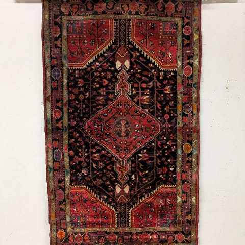Pitkänomainen itämainen matto, jossa on monimutkainen kuviointi ja hapsut molemmissa päissä. Värimaailma on pääosin vihreä ja sininen.