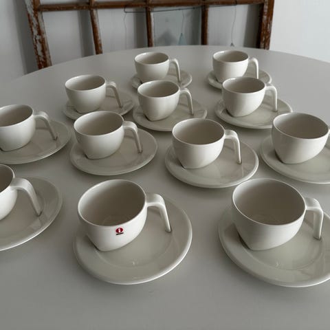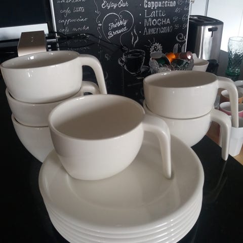 Kupit myydään suoraan käytöstä, normaalia kulumaa mutta ei lohkeamia tai muuta isompaa. Kiva, reilun kokoinen kuppi mutta ei enää kuulu omiin suosikkeihin, joten aika näistä luopua.