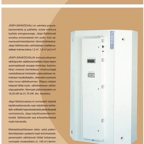 Jäspi/Kaukora VLM-300 S lämminvesivaraaja, tilavuus 290 litraa, valkoinen väri. Valmistusvuosi 2015. Käyttöpaine 1,0 MPa, sähköteho 1,5 kW, jännite 230/400 V, taajuus 50 Hz. Soveltuu veden lämmitykseen kotitalouskäytössä. Myydään pois remontin alta. Poistettu toimivana käytöstä.