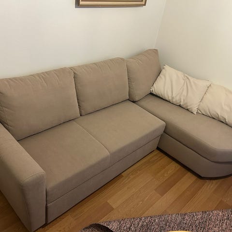 Sohva on hyväkuntoinen. Juuri pesty runkoa myöden. Runko on tukeva. Divaanin alla löytyy säilitystila. Savuttomasta asunnosta (ei tupakoitu sisällä). Divaanin puolta voi vaihtaa. Mitat Leveys 240cm syvyys 90cm divaani 160cm vuode 140x200cm.