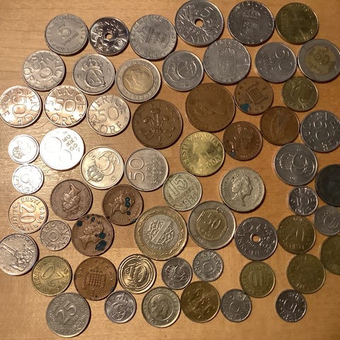 Kokoelma erilaisia kolikoita, 1, 5 10, 20 ja 50 pennisiä eri materiaaleista keräilijälle/ tarjoa