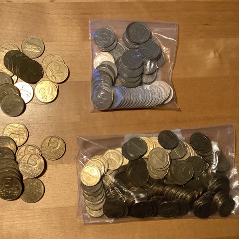 Erilaisia suomalaisia kolikoita kokoelma pussitettuina