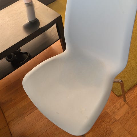 Sininen tuoli kangas verhoilulla. Yksi nappi puuttuu.