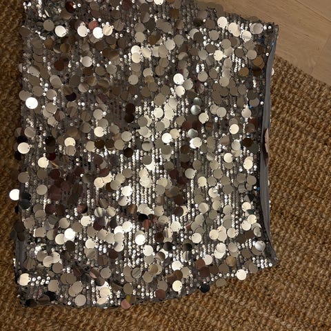 Puseron etuosa on koristeltu paljetein. Väri: harmaa -beige.