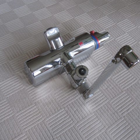 Käytetty hanasetti, sisältää kuvassa näkyvät hana, suihkuletku, suihkupää ja -tanko sekä suihkupään seinäpidike.