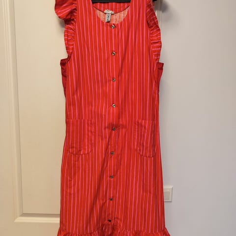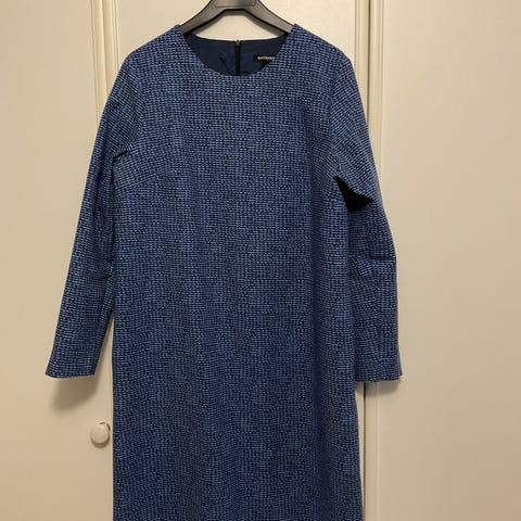 Pukeva A-linjainen malli, taskut sivusaumoissa, vetoketju takasaumassa, puolipitkät hihat, valkoinen vuori. Vastaa kokoaan 42, kai-kai n. 52 cm, olka-helma n. 89 cm.