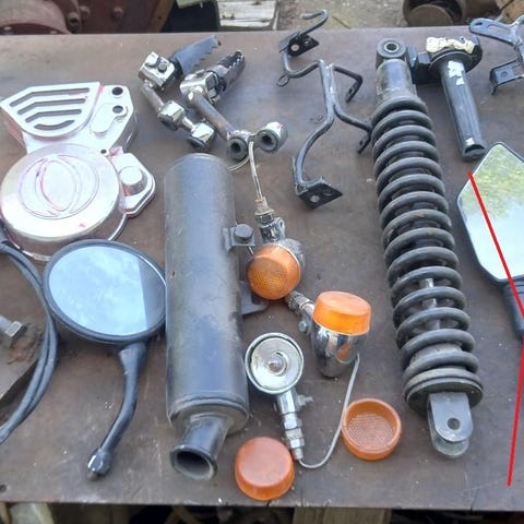 Toinen runko ja puolikas moottori mukaan, sekä erinnäisiä osia. Runkokin vaatii hitsausta kun pala leikattu moottorin edestä pois. Varmasti puuttuu joitain osia. Vuosimalliltaa osat taitaa sijottua johonkin 85-90 välille.