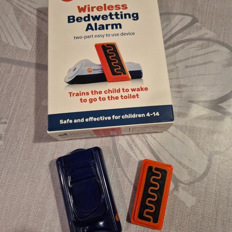 Rodger merkkinen yökasteluhälytin ja siihen kuuluvat tyttöjen housut. Hälytistä oli meille paljon apua, suosittelen! Hälytimessä on äänen voimakkuuden sekä melodian valinnan mahdollisuus, sopii hyvin herkälle lapselle. Housut ovat suunniteltu tytöille ja niihin kiinnitettään hälytimen nappi.