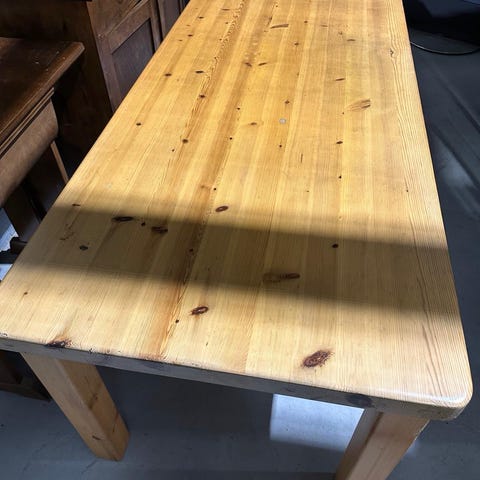 Tammipöytä, metallijalat. Itsetehty. Pientä käytönjälkeä. Yksi kulma hieman noussut.