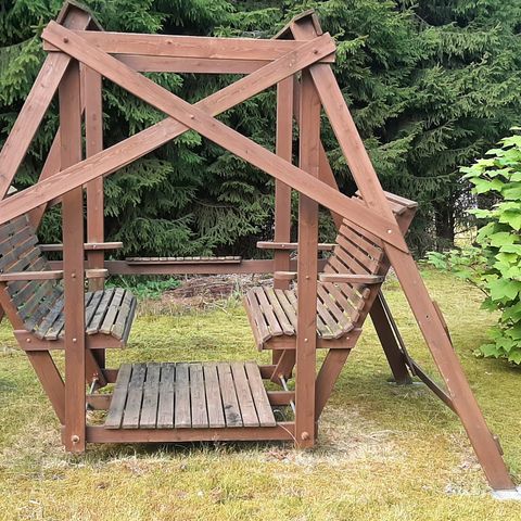 Tuulimylly pihan koristeeksi tai tuulen suuntajan näyttäjäksi Korkeus kurkiaiselle 1,17m siipien kärkiväli 66 cm siivet ja yläosa iroitettavissa kuljetusta varten
