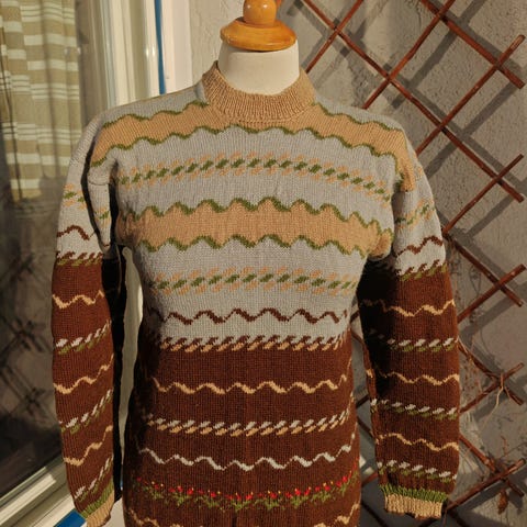 käsinneulottu villaneule, palmikkoneule, harmaanliila neule, vintage-tyyli, käsityö, talvivaatetus