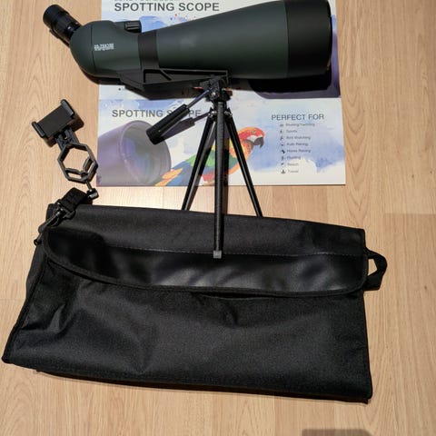 Sky-Watcher Skymax-102 kaukoputki. Newton-tyyppinen kaukoputki, objektiivin halkaisija 102 mm ja polttoväli 1300 mm. Mukana jalusta ja kiinnikkeet tarkkaan suunnan säätöön.