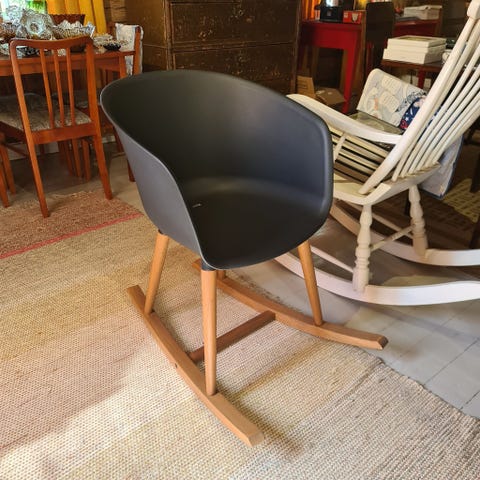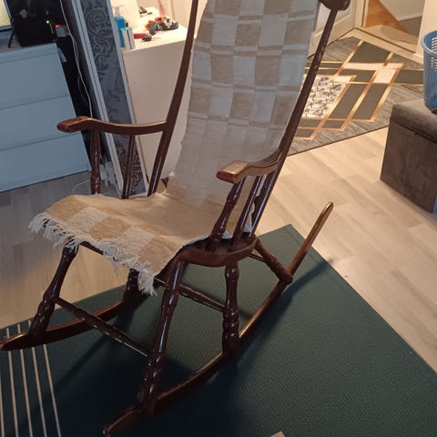 Maalipinnassa kulumaa, muuten ehjä ja hyväkuntoinen kiikkutuoli.