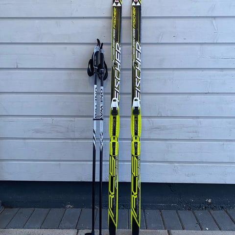 Hyväkuntoiset Fischer sukset sauvoineen.