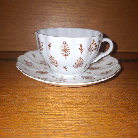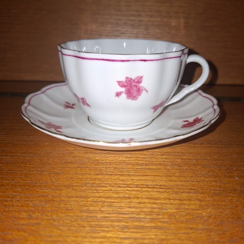 Kruunuleima. Ehjä. Tassin kuvio ei ole niin priima kuin kupin. Jotain valmistuksen aikaista värin leviämää tassin alapuolella. Ei Toridiiliä. Nouto tai Matkahuollon lähetys.