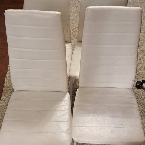 Annetaan kuvanmukainen valkoinen tuoli, jonkin verran tummentumaa mutta yleisilmeeltään siisti.