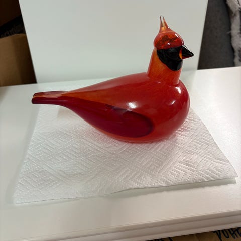 Oiva Toikan kaunis punainen lasilintu Kardinaali, valmistaja Nuutajärvi. Signeerattu OT II Nuutajärvi. Linnun korkeus noin 13,5 cm, pituus n. 19 cm, leveys n. 10 cm.