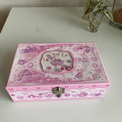 Upea korurasia, jossa useita lokeroita erilaisten korujen säilytykseen. Rasiassa on kuvassa näkyvät osat ja koristeelliset tekotimantti kahvat.