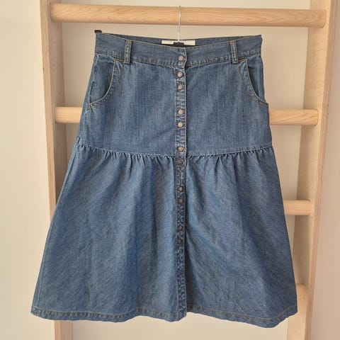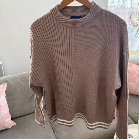 Myydään naisten Lexington Orcanic cotton/cashmere pitkä neulehame. Värissä beige, Valkoiset raidat helmassa sekä molemmin puolin pienet halkiot helman sivusaumoissa. Materiaali joustaa. Laput kiinni.