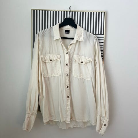 Vaaleanpuna-valkoruudullinen naisten kauluspaita 100% puuvillaa. Materiaali ei jousta. Kainaloissa jonkun verran värjäymää, ei ole yritetty poistaa tahranpoistoaineella. Muuta huomautettavaa kunnosta en löytänyt.