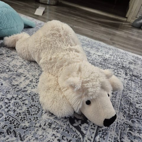 Jääkarhupehmolelu kaipaa uutta kotia ja uusia leikkikavereita. Se on pehmeä ja hyvässä kunnossa ja asunut savuttomassa ja eläimettömässä kodissa. Jääkarhun pituus on noin 65 cm (kuonosta töpöhäntään).
