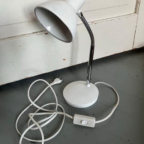 38 cm korkea valaisin/lamppu, varjostimen väri vaalea lila. Toimii E 14 polttimolla.