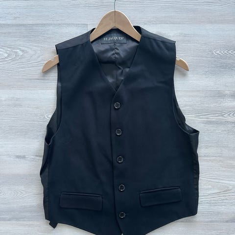 Musta miesten liivi, koko 48. Liivissä on 5 nappia edessä ja säädettävä remmi takana istuvuuden säätämiseksi. Taskut edessä. Materiaali 65% polyester ja 35% viskoosi.