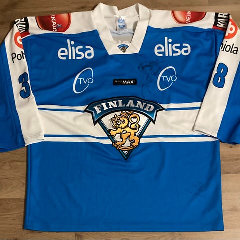 Aito pelattu jääkiekko maajoukkueen pelipaita. Käytetty joskus 2000-luvun ensimmäisen vuosikymmenen EHT turnaunsissa. Paidalla pelannut puolustaja #3 Petteri Nummelin
